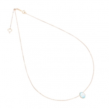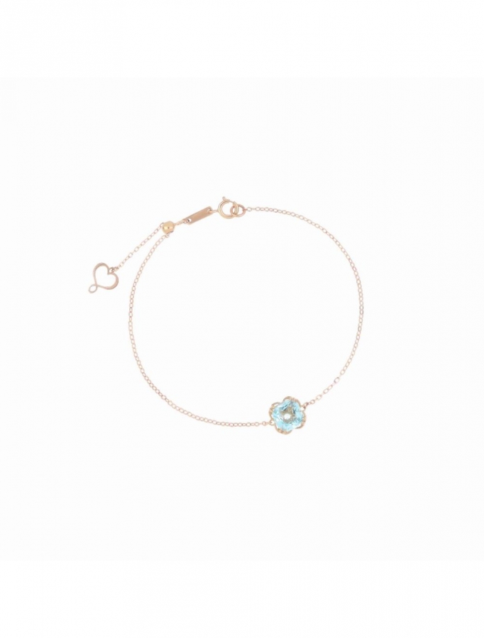 Bracciale Marie Antoinette realizzato in oro rosa 18 carati. Il bracciale presenta un castone centrale con pietra di Topazio Top quality azzurro con taglio antico di diametro 6 mm. La superficie del castone è costituita da cuori Maman intrecciati. La lunghezza del bracciale è regolabile fino ad un massimo di 18,2 cm. Cuore Maman traforato e chiusura con anello a molla.