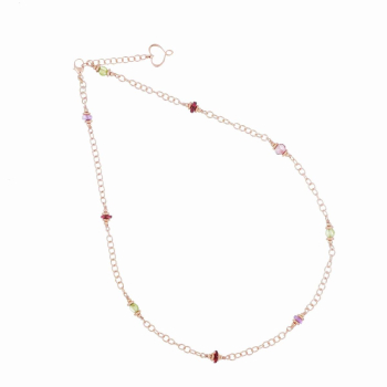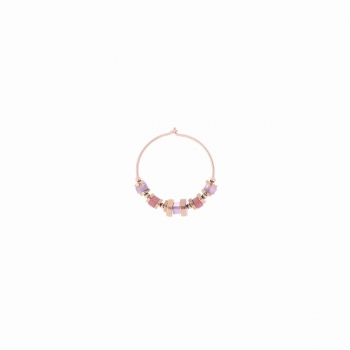 Orecchino a cerchio singolo realizzato in argento 925 con galvanica oro rosa ad alto spessore e resistenza. Il cerchio ha un diametro di 25 mm e presenta una cascata di pietre di Tormalina rosa e Peridoto verde oltre a sfere decorative. La lunghezza totale dell'orecchino è di circa 55 mm. Il gioiello verrà spedito con scatola e garanzia originali Maman et Sophie.