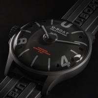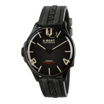Orologio da uomo della collezione Darkmoon di U-BOAT. La cassa in acciaio AISI 316L con trattamento camouflage, completamente riempita di uno speciale olio che mette in risalto il quadrante, creando l’illusione dell’assenza del vetro, con un effetto di un nero più intenso e di una maggiore leggibilità. Bolla d'aria a vista sul quadrante per compensare le variazioni di temperatura. Distintivo proteggi corona a sinistra. Diametro 44,8 mm.Il quadrante bombato in metallo nero, indici e numeri trattati con superluminova grigio. Sfere in metallo verniciato con superluminova grigio.MOVIMENTO :la precisione Svizzera del movimento al quarzo Ronda 712.3 lubrificato in bagno d’olio.Fondo con innovativo sistema di chiusura (Locking Ring System) con sostituzione rapida della batteria. La scansione del QR code dà accesso ad un’esperienza digitale esclusiva.VETRO zaffiro di altissima qualità, bombato.FUNZIONI:ore, minuti, corona a vite.CINTURINO in gomma vulcanizzata ultra-resistente, colore nero, personalizzata con il logo della Maison in rilievo. Larghezza: 22/20 mm.IMPERMEABILITÀ:50 mt, 5 ATM. I'orologio verrà spedito con scatola e garanzia originali di due anni.Immagini