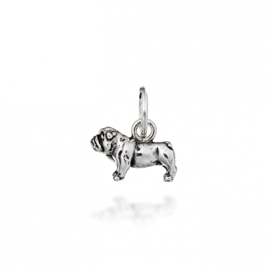 Charm in argento 925 * , Bulldog di Raspini, realizzato artigianalmente a mano in Italia. Il charm è munito di maglina con logo Raspini e può essere inserito facilmente su collane, bracciali, portachiavi e orecchini, personalizzando ogni gioiello.Immagini