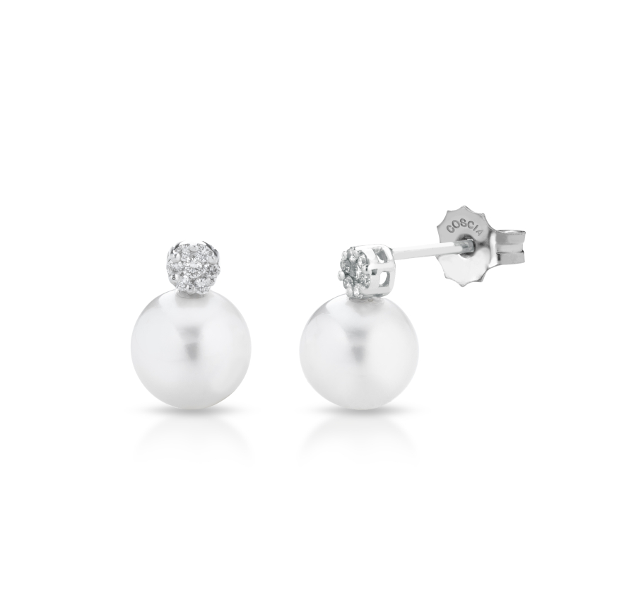Orecchini in oro bianco 18 kt con Perla Akoya da 8.5/9mm di diametro impreziositi con diamanti da 0.16 ct e comoda chiusura a farfallina di Coscia. Il gioiello è interamente fatto a mano in Italia da mastri orafi. Questo Gioiello verrà spedito con scatola e Garanzia originali Coscia.