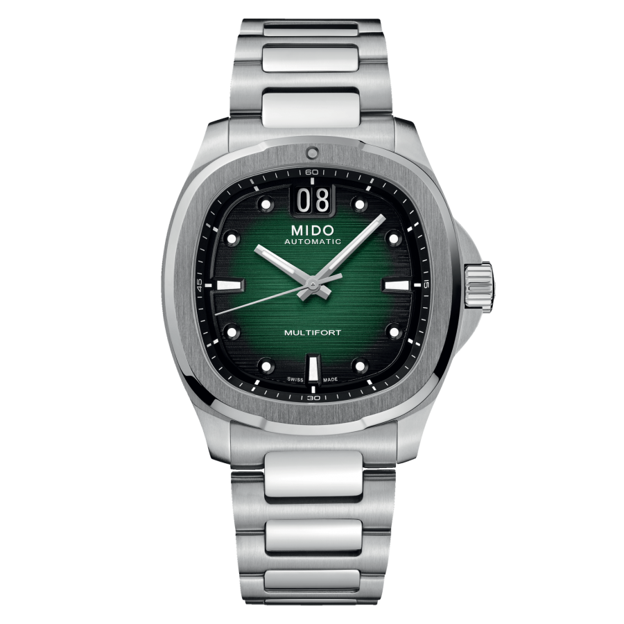Orologio automatico da Uomo della collezione Multifort di MIDO. La cassa a forma di TV torna al centro della scena per il Multifort TV Big Date, tanto intenso quanto preciso, grazie al suo formidabile movimento meccanico con riserva di carica pari a 80 ore. Cassa con Fondello a vista, Corona a vite. le dimensioni sono di 39mm x 40mm con uno spessore di 11.5mm, il materiale è acciaio inossidabile. Il quadrante color verde con vetro zaffiro antiriflesso da entrambi i lati. Il cinturino è in acciaio inossidabile. La resistenza all'acqua è di 10 atm . Il gioiello verrà spedito con scatola e garanzia di due anni originali MIDO.